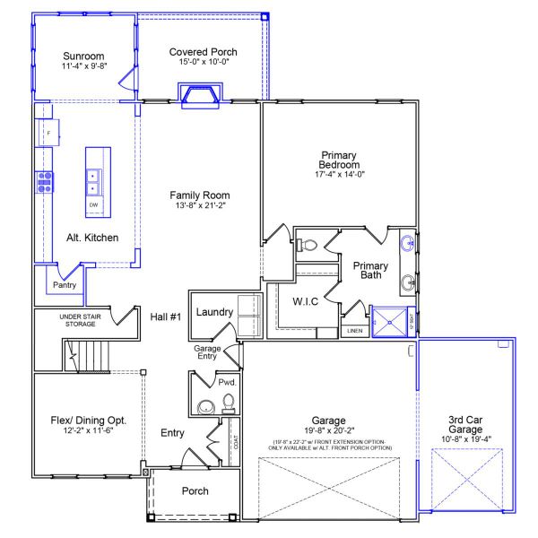 The Savannah is a two-story home with five bedrooms and three-and-one-half bathrooms. Upon entering, you are greeted by a flex space that can be converted into a dining room with an optional coffered ceiling. The great room, with an optional fireplace, is open to the kitchen and eat-in. The kitchen has two layouts to choose from and the option to add a butler’s pantry. The coveted first-floor primary suite includes a private bath with various shower and tub combinations. The primary bedroom has an optional boxed ceiling as well. A bench and cubbies can be added to the garage entry. Additional options include an enlarged covered porch or sunroom. A powder bath and laundry room complete the first floor. Upstairs are four secondary bedrooms, one full bath and a loft space. The loft can be converted into a bonus room or sixth bedroom with an additional full bath, or bedroom two can be made a secondary primary suite with private bath and walk-in closet.
