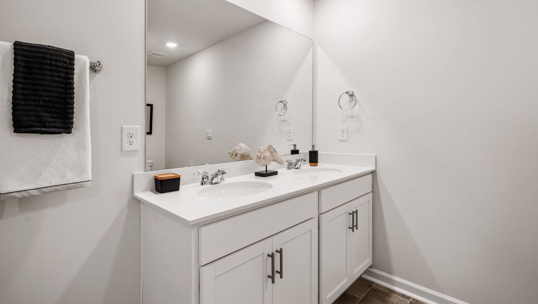 A conveniently located half bathroom is situated off the living room. Moving upstairs, you’ll find two bedrooms, which share a bathroom complete with a vanity and tub. The upstairs laundry room is also ideally located for easy access. On the opposite side of the floor, the primary bedroom features privacy and comfort. The en-suite primary bathroom boasts a double vanity and a walk-in shower with glass panels. The spacious walk-in closet is bathed in natural light, thanks to a window that brightens the space.