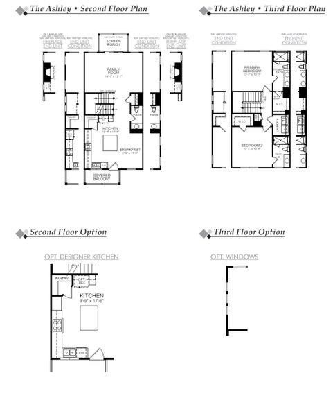 The Ashley is a three-story, three-bedroom, three-and-a-half-bath townhome with a first-floor guest suite with full bath. The second floor features a spacious family room, kitchen with island and pantry, balcony, and an estended screen porch. The third floor features dual primary bedrooms each with full, attached baths.