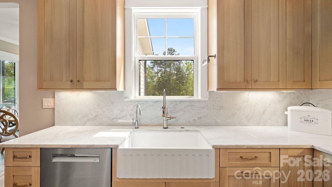The chef’s kitchen is a true showpiece, outfitted with top-of-the-line Wolf appliances including double steam ovens, a 36” six-burner range with wok grate, microwave drawer, and a powerful 1200 CFM vent hood, complemented by a Bosch 800 Series dishwasher and refrigerator. The space is anchored by stunning 3CM Blanco California quartzite countertops and backsplash with custom quarter-sawn white oak cabinetry that extends throughout the kitchen, pantry, built-ins, and even the half bath.