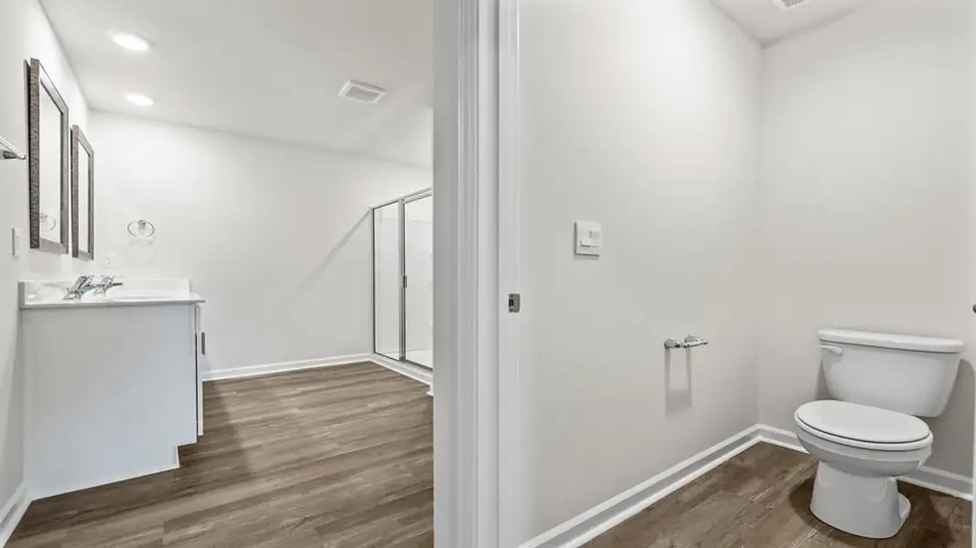 The large primary bedroom is a true retreat, complete with a walk-in closet and a luxurious en suite bathroom. The dual vanities, and spacious shower create a spa-like atmosphere, perfect for relaxing after a long day. On the opposite end of the home, you’ll find two additional bedrooms and a secondary bathroom, featuring privacy and convenience.