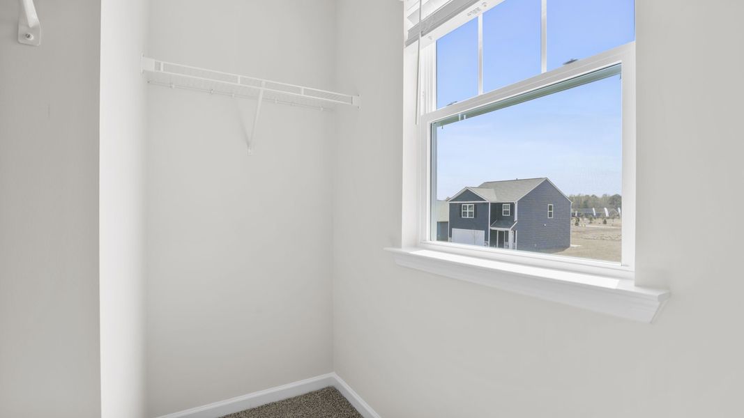 Upstairs, the primary suite provides a tranquil retreat with a generous bedroom space, an en suite bathroom, and a walk-in closet. The two additional bedrooms also feature walk-in closets and share access to a secondary bathroom. The laundry room completes the second floor, adding convenience to daily tasks.