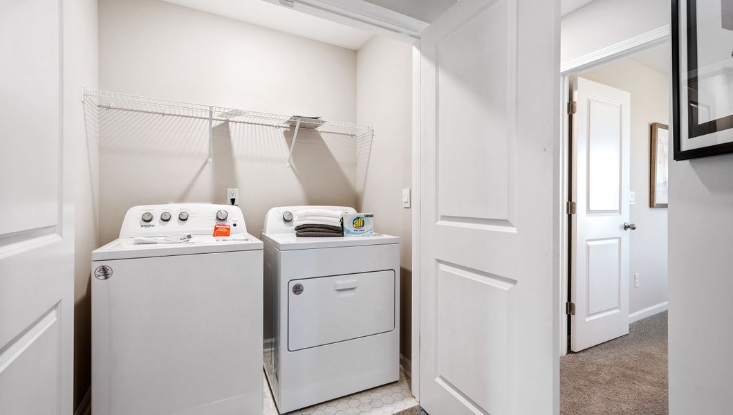 A conveniently located half bathroom is situated off the living room. Moving upstairs, you’ll find two bedrooms, which share a bathroom complete with a vanity and tub. The upstairs laundry room is also ideally located for easy access. On the opposite side of the floor, the primary bedroom features privacy and comfort. The en-suite primary bathroom boasts a double vanity and a walk-in shower with glass panels. The spacious walk-in closet is bathed in natural light, thanks to a window that brightens the space.