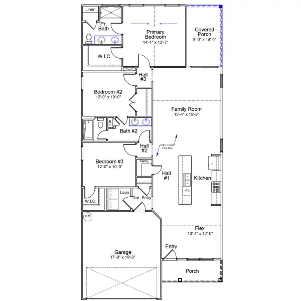 One-story living at its very finest, the Brunswick plan features three bedrooms, two bathrooms, and a two-car garage. Situated just off the foyer is a flex space that leads to the kitchen. The kitchen is equipped with a large island with plenty of seating area, luna pearl granite countertops, white cabinetry with crown and hardware, and an electric cooktop. Soaring vaulted ceilings define the main living areas. A sliding glass door leads to your rear patio, which features a covered porch – the perfect place to enjoy your backyard. Two secondary bedrooms share a bathroom with dual sinks! The primary suite includes a vaulted ceiling, dual sinks, a spacious walk-in closet, and a fiberglass shower. This home is completed by luxury vinyl plank flooring throughout the main living areas, and the laundry room has cabinetry for added storage. The Brunswick is a great plan, make it your new home at Ellington!
