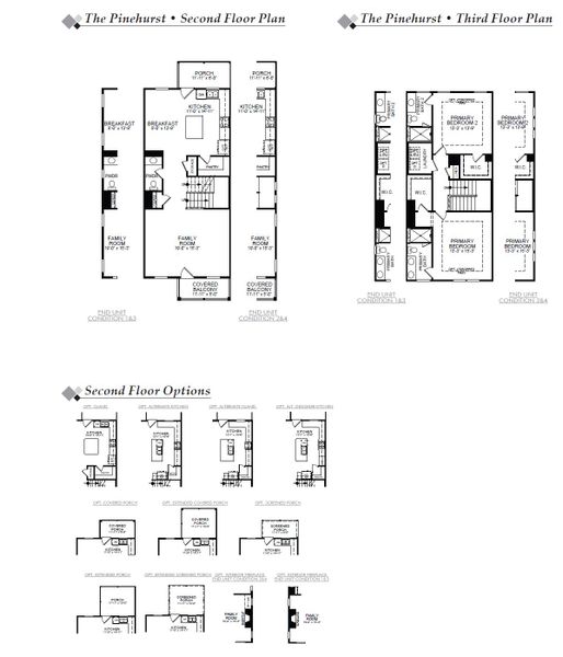 The Pinehurst is a three-story, three-bedroom, three-and-a-half-bath townhome with a one-car attached garage and a first-floor bedroom with a full bath. The second floor features a family room, a kitchen with an island and a pantry, a breakfast nook, a balcony, and a screened rear porch. The third floor features two primary bedrooms with private baths and a separate laundry room.