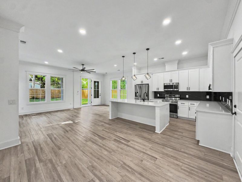 This beautifully crafted new construction home offers the perfect blend of modern style, comfort, and thoughtful design. Featuring inviting front and rear porches, it provides ideal spaces for relaxing outdoors or entertaining guests.Step inside to a bright, open-concept layout with 10-foot ceilings on the main level and 9-foot ceilings upstairs. Oversized doors and abundant windows fill the home with natural light, creating a warm and welcoming atmosphere throughout.The spacious kitchen is the centerpiece of the home, complete with a large island, quartz countertops, soft-close cabinetry, and a stylish tile backsplash--perfect for both everyday living and entertaining. Elegant finishes such as wainscoting, 5-panel interior doors, and upgraded luxury vinyl flooring add a custom,, high-end feel.