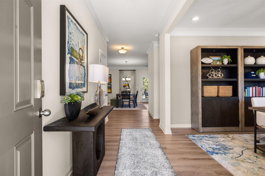 The kitchen is beautifully appointed with granite countertops, an added island that provides extra prep space and seating, and stylish pendant lighting that enhances the overall design. Additional windows in both the breakfast area and family room fill the space with natural light, creating a bright and airy atmosphere. Luxury vinyl plank flooring runs throughout the main level, offering both durability and modern appeal. Both floors feature 9-foot ceilings, adding to the open and spacious feel of the home.