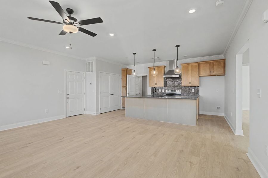 Carothers Farms Town Center Homes offer the perfect blend of comfort and convenience in a vibrant, walkable neighborhood. This thoughtfully designed two-bedroom, two-bath condo features an open-concept living area, a kitchen with a central island, and a spacious laundry room for added ease. Interior photos shown are of the actual home.