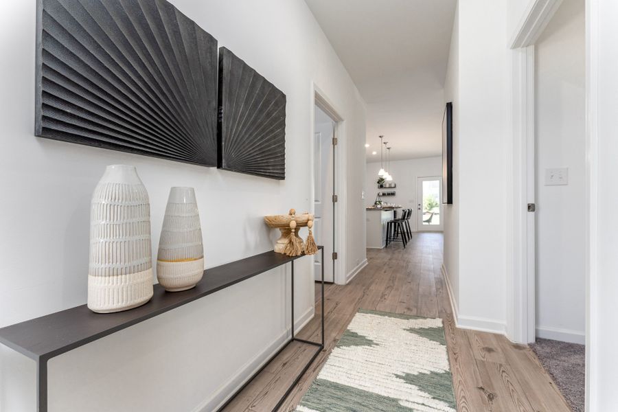 The Phoenix at Jackson Hills by Smith Douglas Homes is the epitome of great use of space. The kitchen offers a large island with raised breakfast bar open to the family room. Thoughtful design of the secondary bedrooms provides extra noise isolation from the front entry hall. For those not needing a third bedroom, the option of a dining room adjacent to the family room is available. With a split bedroom design, the owner's suite is situated at the back of the home away from it all.