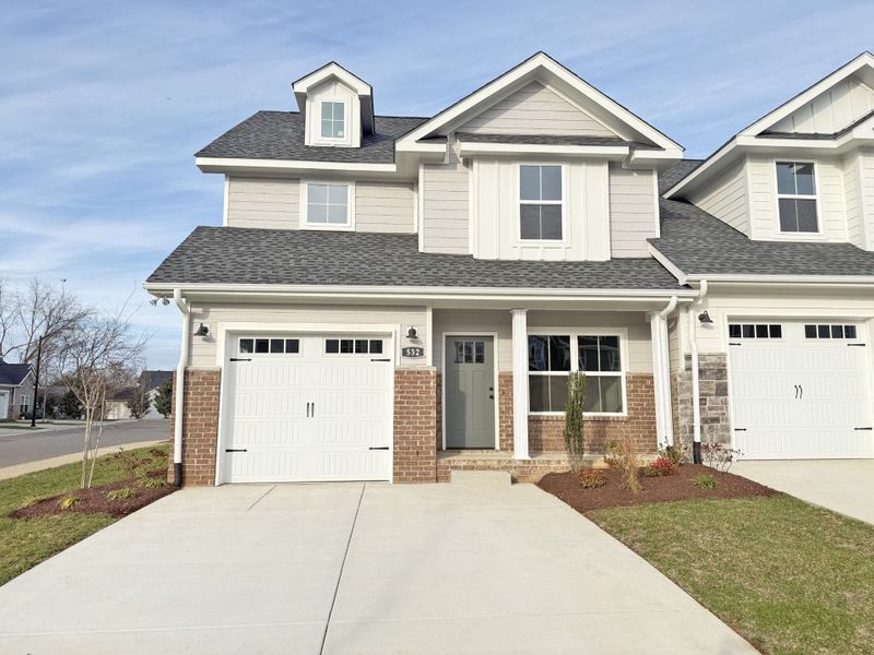 The Denham offers a thoughtful split floorplan with the living room up front and the kitchen tucked privately in back. A welcoming entry opens directly into the spacious living area, while the garage conveniently connects through the central hallway that also includes a pantry, powder room, and under-stair storage. The L-shaped eat-in kitchen provides plenty of counter and cabinet space, and the large laundry room just off the living area adds even more storage. The main bedroom suite is privately located downstairs with a bath featuring dual vanities on opposite walls and a linen closet. Upstairs you'll find two secondary bedrooms, a full bath, and a generous walk-in storage closet—plus additional attic access. Bedroom 2 is the largest in the home, perfect for guests or a home office. Saddlebrook Townhomes is a gated, low-maintenance community in the heart of Murfreesboro, offering modern living and unbeatable convenience just minutes from I-24, I-840, and US-41. Residents enjoy exclusive amenities including a dog park, dog wash station, pickleball court, and a spacious clubhouse with a full kitchen, restrooms, and games—perfect for hosting events or relaxing with neighbors.