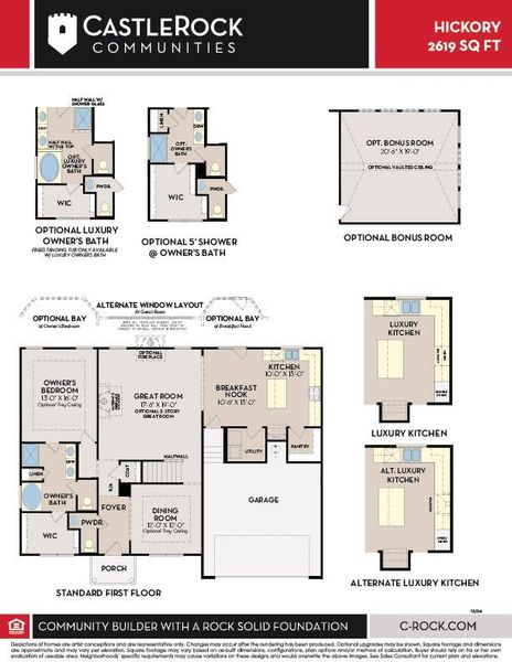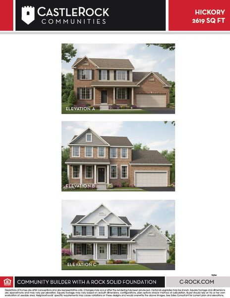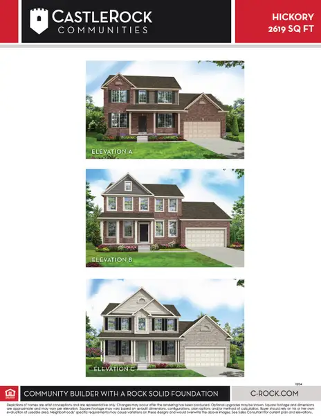Introducing the Hickory plan, a stunning 2-story home that offers 2619 sq. ft. of luxurious living space complete with a 2-car garage. With 4 bedrooms & 2.5 baths, including a downstairs master suite, this home is designed to meet all your needs and desires. Step inside and be greeted by a spacious great room. The possibilities are endless with the option for a two-story layout or an alternate window arrangement. For added warmth and ambiance, consider adding a fireplace to create a cozy atmosphere. Adjacent to the great room, you'll discover a well-appointed kitchen for whipping up your culinary creations, while the breakfast nook offers a delightful space to enjoy your morning coffee. To create additional seating space, opt for a bay at the breakfast nook. The dining room provides an elegant setting for family gatherings or entertaining friends, and you can add a touch of sophistication with an optional trey ceiling. Retreat to the downstairs master suite, where you can customize your sanctuary with options for a bay window, trey ceiling, and luxury bath. Picture yourself relaxing in the freestanding tub or enjoying a refreshing shower in the optional 5' shower. The luxury bath also features a half wall with shower glass and a half wall with a tile top. The upper level of the Hickory boasts additional bedrooms and a bonus room can be enhanced with an optional vaulted ceiling. An additional bathrooms is located on this floor, with the option to include a 2nd. The Hickory also includes practical and functional spaces such as a pantry, a powder room, and a garage. The garage ensures secure storage for vehicles or other belongings, while the powder room offers convenience for guests. Experience the perfect blend of comfort, luxury, and practicality with the Hickory. Its customizable options allow you to create a personalized living space that reflects your unique style and preference.