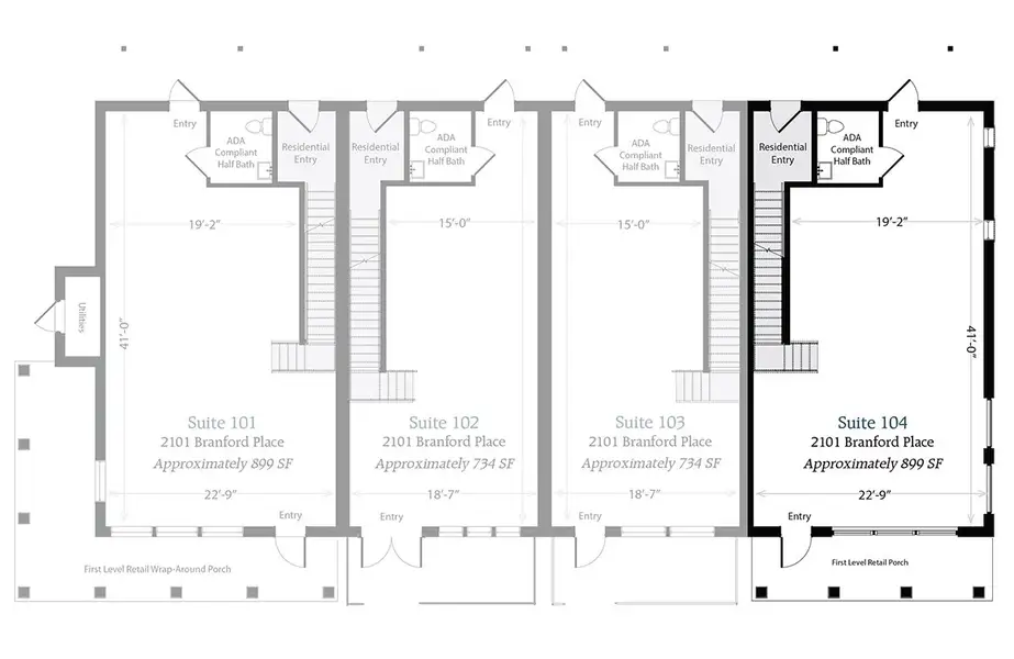 As small business owners, we understand how challenging it can be to find the perfect space to set up shop. At 2101 Branford Place, we empathize with your struggles and offer beautifully designed first-level retail and office space. Our commercial space is perfect for nail salons, accounting offices, photography studios, or craft stores. Our sales representative can help you find the ideal space for your business needs. Please don't hesitate to contact us to learn more. A two-level residential condo is located above and sold separately.