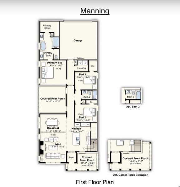 Manning A Plan with optional 4th bedroom and 3rd bathroom upstairs. A beautiful, comfortable plan that welcomes guests as soon as they come through the front door! Your kitchen, breakfast, and living rooms are located on the front of the home, creating a great space for family time or entertaining! From there, continue toward the back, where you will find your primary suite, featuring a large closet, plus 2 spare beds and bath. Take the stairs, from the kitchen, upstairs, where an open playroom, 4th bedroom and another bath await! Blinds and refrigerator included, as well as a front yard irrigation system. Full lawn maintenance provided through HOA.