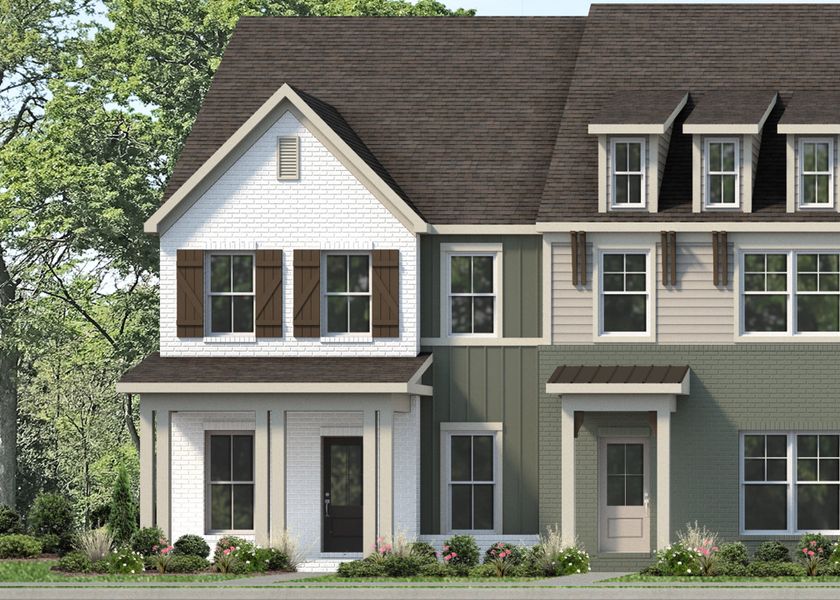 This craftsman-style end unit townhome offers a beautiful blend of classic design and modern finishes, featuring a Hardie board and batten exterior in Smokey Sage with brick accents, a covered front porch, and a one-car garage.