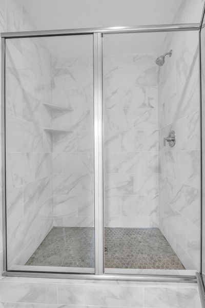 Upstairs, the home offers a spacious owner’s suite with a private bath featuring cultured marble countertops, matte black fixtures, and a tiled shower with niche detail. Two additional bedrooms, a full bath, and convenient laundry complete the second floor. Flooring includes durable Kingsford Rustic Rye Chestnut throughout main living areas and soft carpet in bedrooms.