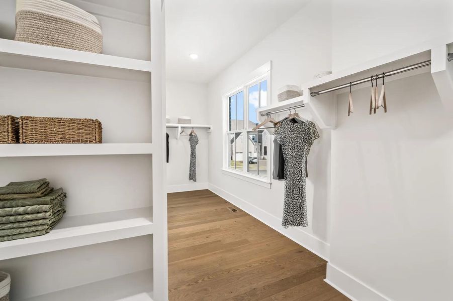 Expansive first-level primary suite, bath and mine and yours walk-in closets