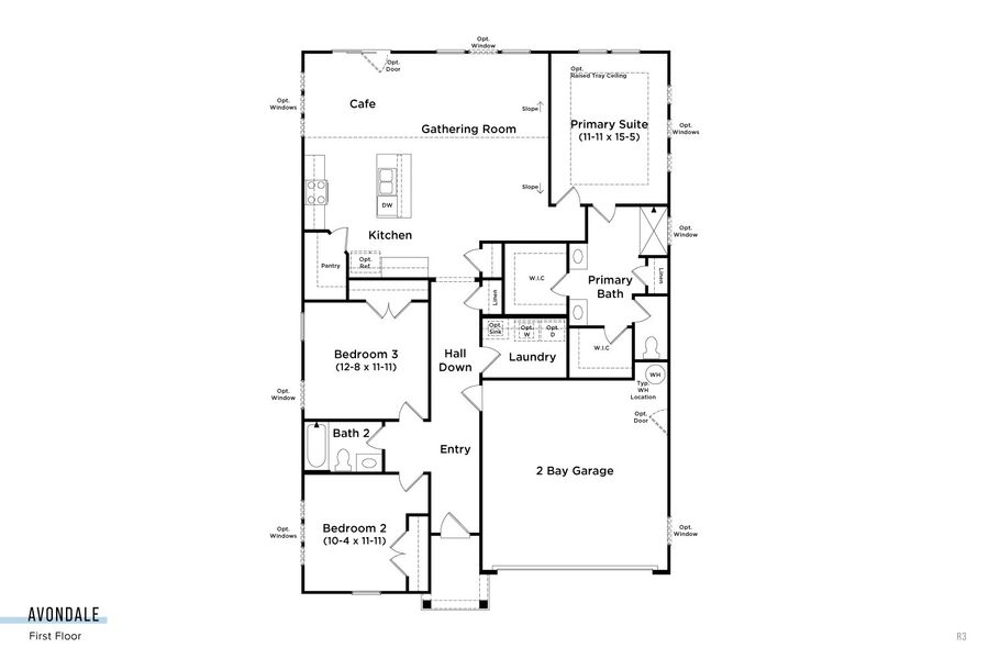 The Avondale features a first-floor primary bedroom and two additional front bedrooms that share a full bathroom. The en-suite primary bathroom features 2 separate vanities, step-in shower, private water closet and 2 separate walk-in closets. The kitchen offers a large walk-in pantry, and a generous island that overlooks to the spacious family room with sloped ceiling and choices to add an electric fireplace.