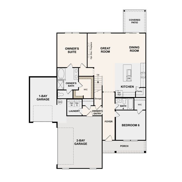 The main living area keeps things open and easy, with an extended kitchen that gives you extra counter space for cooking or gathering. White cabinetry brightens the space, while the electric fireplace with shiplap adds a cozy focal point. Just off the great room, the covered patio makes it simple to take things outside.