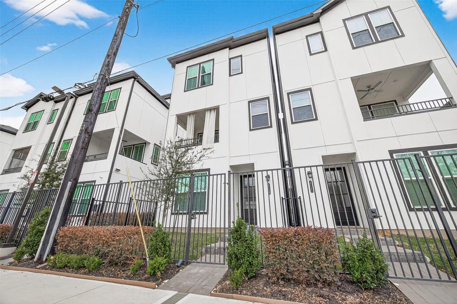 A refined blend of modern design and urban convenience, this 2024 CitySide Homes residence is set within the gated Buffalo Landing community. A private front-yard entry and covered porch introduce interiors defined by high ceilings, hardwood floors, and abundant natural light. The open-concept living level features a striking chef’s kitchen with quartz countertops, expansive island, walk-in pantry, premium Samsung appliances, wine cooler, and designer lighting. A covered balcony extends the living space outdoors. The primary suite is a true retreat, offering dual custom walk-in closets and a spa-inspired bath with soaking tub, glass-enclosed shower, and refined finishes. A first-floor en-suite bedroom provides exceptional flexibility, including short-term rental potential. Additional highlights include a tankless water heater, smart garage system, and resort-style community amenities—all moments from Houston’s Medical Center, Museum District, and premier dining.