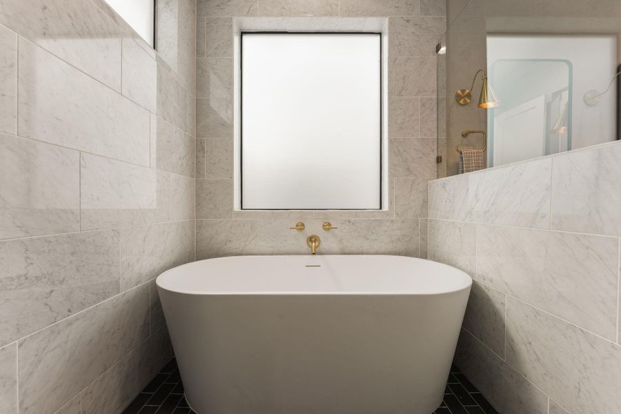 The kitchen is built for serious entertaining — a waterfall quartz island, custom cabinetry, a full Thermador appliance suite, and a dedicated butler's pantry with a wine fridge. The main-level primary suite is its own retreat: a spa bath wrapped in marble, designed with the same deliberate calm as the rest of the home. Upstairs, spacious secondary bedrooms and a versatile second living space offer room to spread out. A 1-car garage and carport complete the package.