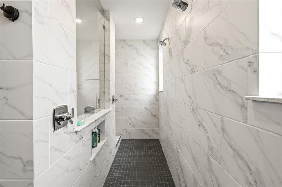 The primary suite is truly exceptional, featuring high ceilings with beams, a spa-inspired bath with an expansive shower and soaking tub, and a massive walk-in closet designed to keep everything beautifully organized.