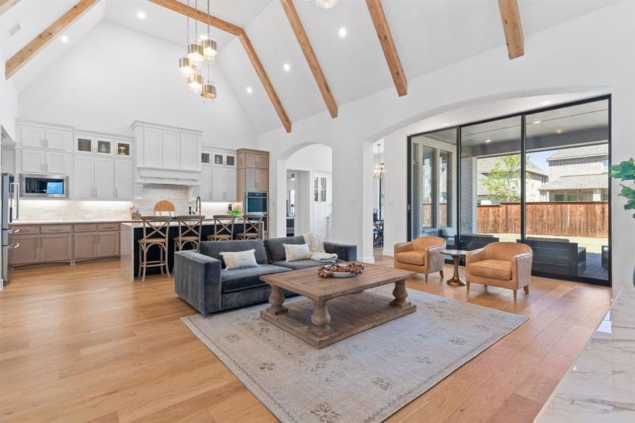 Stunning, like-new single-story Highland Plan 292 on a 74 ft. lot in award-winning Mustang Lakes, this home zoned to Prosper ISD. Impeccably maintained with designer finishes throughout. Upon entry, a striking glass-enclosed study makes a statement. Three spacious secondary bedrooms are positioned at the front, two with en suite baths. The home opens to a grand living area with soaring cathedral ceilings, decorative beams, abundant natural light, and a gorgeous fireplace as the focal point. The chef’s kitchen features Taj Mahal quartz with a waterfall island, brushed gold plumbing fixture, brushed bronze hardware, double ovens, gas cooktop, built-in microwave, and ample cabinetry with pull-out drawers and spice racks, perfect for prep or entertaining. Additional living space includes a separate game and media room. Retreat to a tucked-away primary suite with a sitting area and spa-like bath. Enjoy a spacious backyard with a covered patio, an ideal canvas for your dream outdoor oasis. Community amenities include resort-style pools, a fitness center, sports courts, 18 miles of trails, and a 20-acre park with a private lake and island.