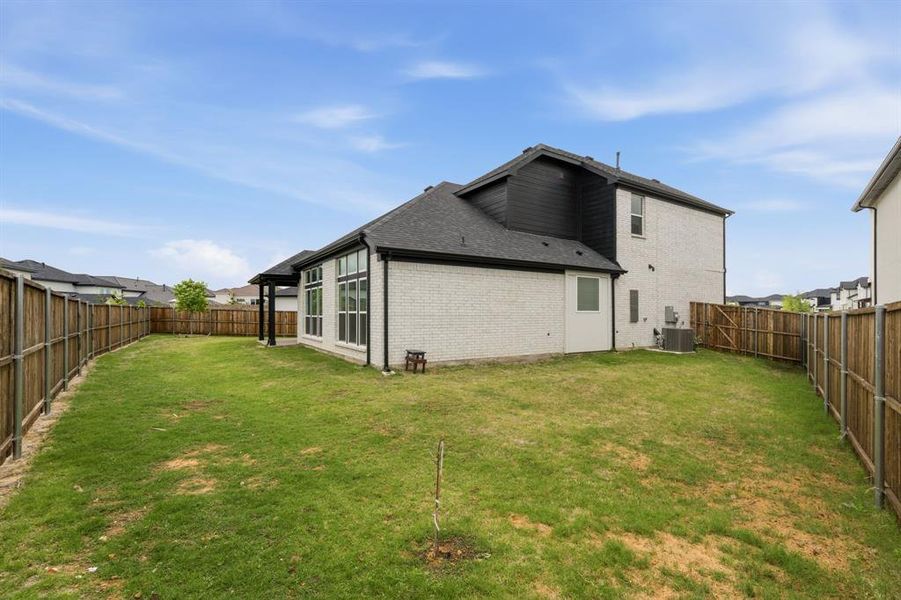 Welcome to 10588 Born Free Road in Frisco, TX, this beautifully upgraded home showcases a modern open-concept design with wide-plank wood flooring and a stunning chef’s kitchen featuring quartz countertops, a large accent island, custom white cabinetry with matte black hardware, and stainless steel appliances including a gas cooktop, built-in oven and microwave, refrigerator, and dishwasher. Stylish pendant and recessed lighting enhance the bright, airy space, while the bathrooms offer quartz vanities and sleek matte black fixtures, highlighted by a spa-like glass-enclosed walk-in shower with floor-to-ceiling tile and built-in bench. Thoughtfully designed with high-end finishes throughout, this move-in-ready home perfectly blends comfort, functionality, and contemporary style in a prime Frisco location. Step outside to a covered patio, ideal for relaxing evenings or hosting guests.