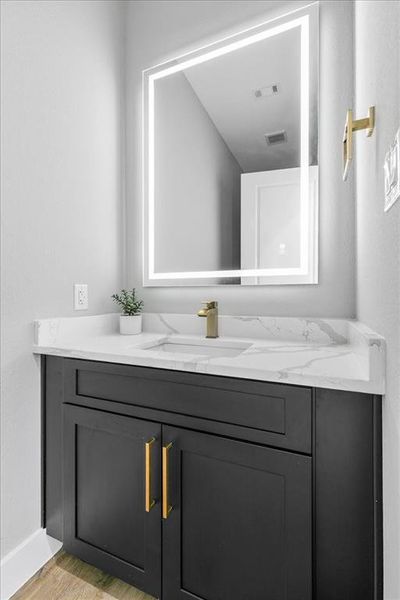 Ten-foot ceilings throughout—recessed to 11 feet in the entry, living room, and primary suite—create an airy, refined feel. Luxury 9” wide LVP flooring runs throughout the home. The chef’s kitchen features striking Calacatta quartz with gold veining paired with black quartz, a 4.5’ x 7’ storage-rich island, gas range, stainless steel appliances, and elegant black-and-white cabinetry with gold-toned hardware. All cabinetry is soft-close and includes a lazy Susan, trash compartment, and spice rack. Lighted cabinets. Upgrade to tankless pre-plumbed.