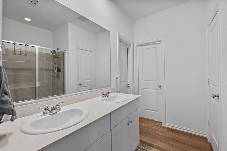 When it is time to unwind, retreat to the private primary suite thoughtfully tucked away at the back of the home. This peaceful sanctuary features a generous walk in closet and a beautiful attached bathroom complete with dual sinks and a dedicated linen closet. Two additional bedrooms are situated toward the front of the home, offering plenty of space for family, guests, or a home office, all conveniently sharing a stylish second full bathroom.