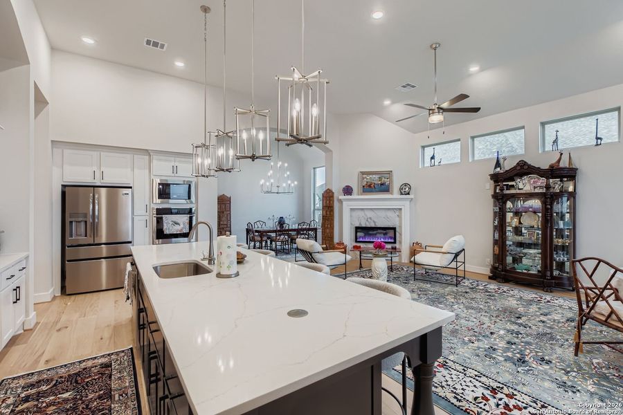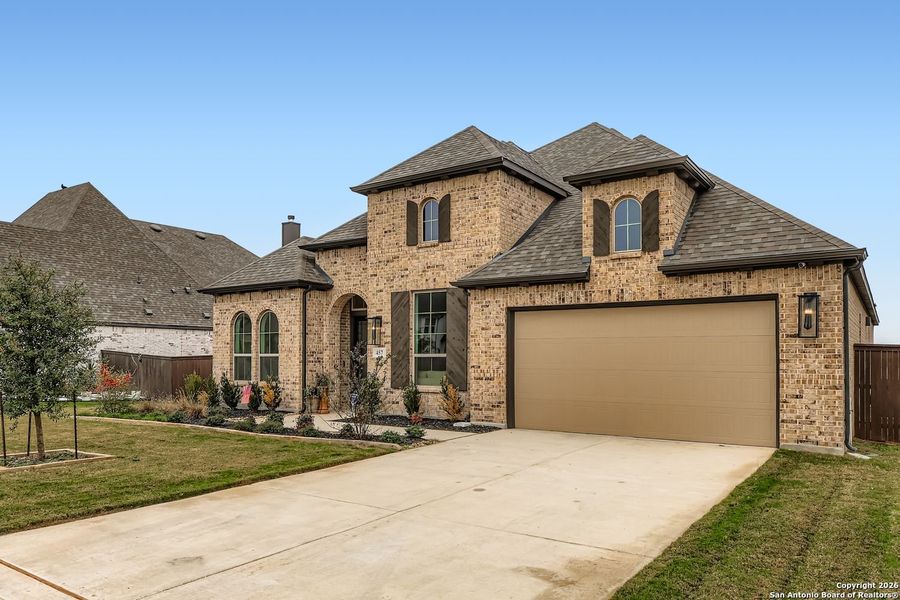 Stunning single story luxury home on a greenbelt with media room and 3 car tandem garage. This nearly brand new 4 bedroom, 3.5 bath, 2,939 sq. ft. Highland home offers a rare blend of modern design, thoughtful upgrades, and functional elegance. Soaring ceilings, expansive windows, and abundant natural light create an open, airy feel throughout. The chef's kitchen is a true showstopper featuring extensive custom cabinetry, double ovens, induction cooktop, designer backsplash extending to the ceiling, and a custom built-in wine rack seamlessly incorporated into the cabinetry. The living area is anchored by an instant electric fireplace and enhanced by a whole-home Sonos sound system, making it ideal for entertaining. The spacious floor plan includes a private study, a dedicated media room, and an ensuite secondary bedroom, perfect for guests or multigenerational living. The luxury primary suite offers a spa inspired bath with soaking tub, oversized walk in shower, double vanities with makeup counter, and a massive walk in closet that connects directly to the laundry room for ultimate convenience. This functionally designed laundry room includes a utility sink, folding area, linen closet, and additional cabinetry. Additional highlights include two water heaters, water softener loop, sprinkler system, and an EV-ready 3-car tandem garage. Situated on a greenbelt lot, this home offers privacy, peaceful views, and modern efficiency all within a highly desirable community & some of the builder warranties left. A rare opportunity to own a move in-ready, single story luxury home with premium upgrades and exceptional design.