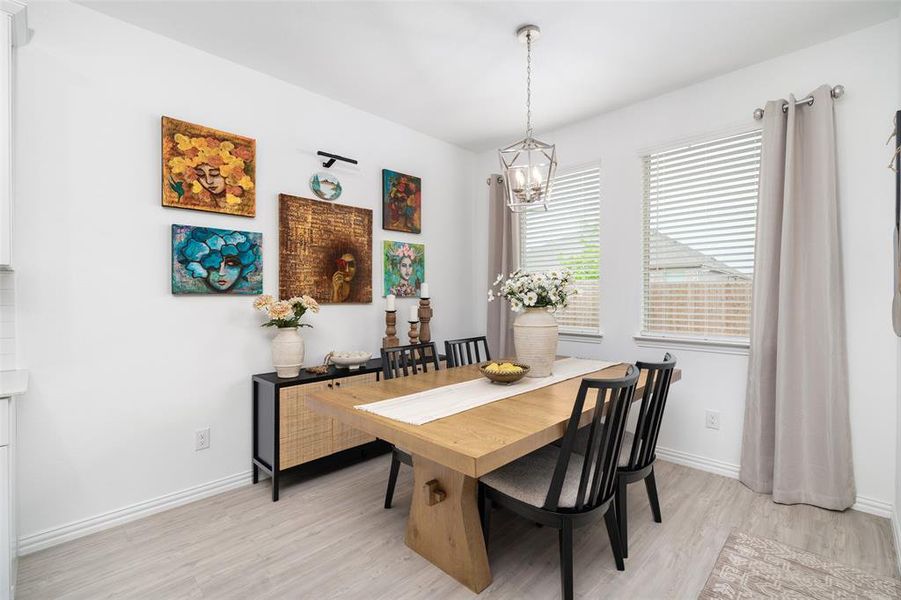 From the moment you arrive, the attractive brick elevation, landscaped yard, inviting covered entry, and added brick flower beds and decorative brick tree rings in both the front and backyard create standout curb appeal. Inside, you’ll find engineered wood flooring, abundant natural light, neutral finishes, decorative lighting, and a spacious living, dining, and kitchen area that feels both open and welcoming.