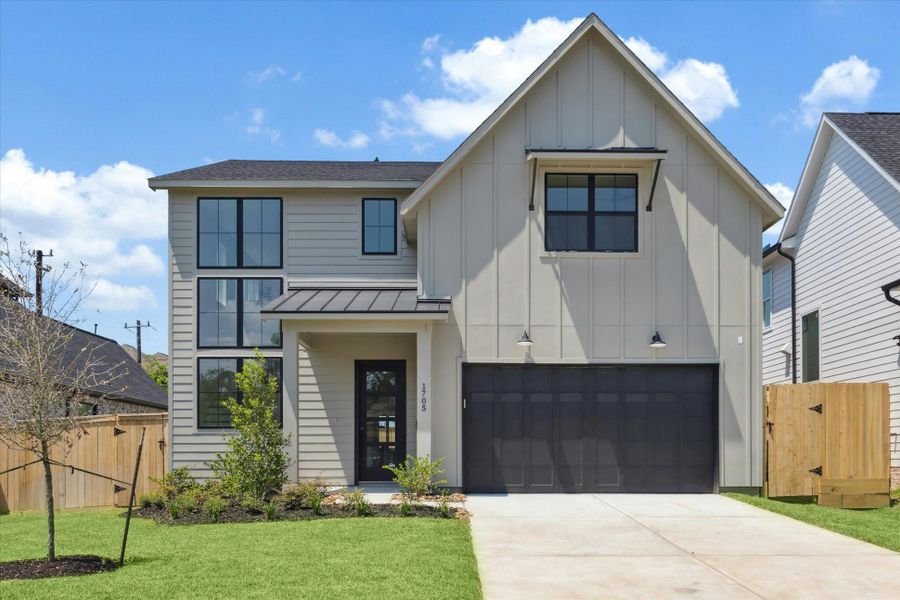 This brand new single family residence has the perfect layout. Upon entry you're greeted by a grand staircase and a two-story foyer. Past the staircase you'll find a dining area, connected to the kitchen via a working pantry, as well as a huge living area and additional bedroom or office space with full bath on the ground level. The living areas are connected to the covered outdoor living space, making this plan ideal for entertaining. Upstairs there is a primary suite, three additional bedrooms, a laundry room, and a gathering space for children and adults alike. Designed by prominent firm Elm Residential in a Modern Farmhouse style, this home features board and batten and lap siding, stainless steel roofing accents, as well as oversized single-hung windows and a partial glass front door.