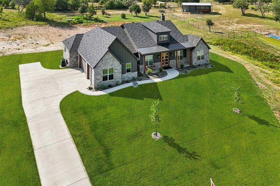 Experience the perfect blend of tranquility and convenience in this stunning 4-bedroom, 2.5-bath home set on a picturesque 2-acre lot with no HOA. Just 12 minutes from Weatherford Square, you’ll enjoy the quiet beauty of the countryside—complete with deer, doves, and other wildlife—while staying close to shopping, dining, and entertainment. Enter to find a bright, open living room with a vaulted, beamed ceiling, a striking fireplace, and expansive windows framing sweeping views of the outdoors. The gourmet kitchen is a showstopper, featuring a large island with seating, sleek stainless steel appliances, abundant storage, designer finishes, and a cheerful breakfast nook. The private primary suite is a true retreat, boasting a spa-inspired bath with dual vanities, a soaking tub, an oversized walk-in shower, and an impressive walk-in closet. Additional bedrooms and a full bath provide plenty of comfort for you and guests. Enjoy the serene outdoor living spaces with a welcoming front porch and a covered back patio—perfect for sipping coffee at sunrise or unwinding with breathtaking sunset views. If you’re seeking a home that combines elegance, comfort, and the peace of wide-open spaces, this one has it all. Don’t miss the 3D tour available online! Bundled service pricing available for buyers. Connect with the listing agent for details.