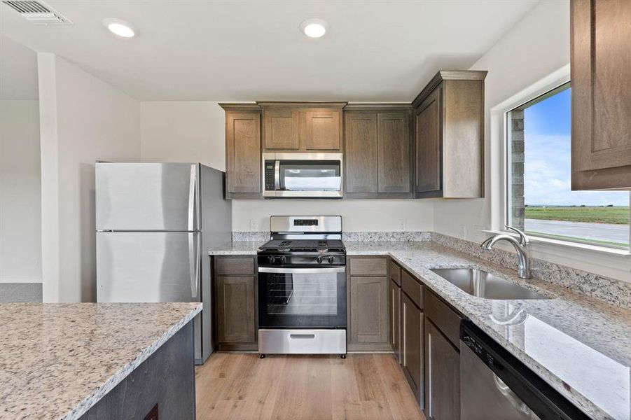 - DishwasherMicrowave OvenOvenRefrigeratorDisposalGas CooktopGranite countertopKitchen IslandGas OvenKitchen Range