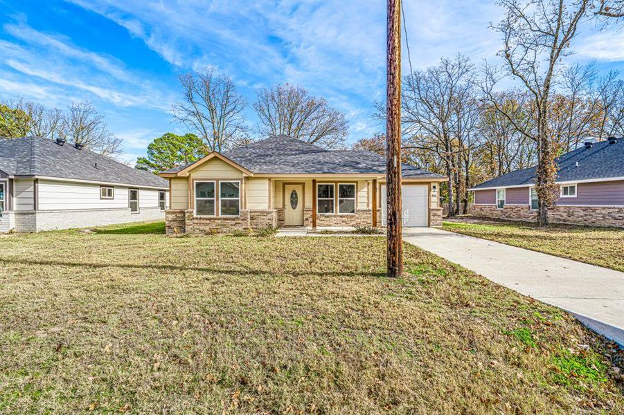 Don't miss this opportunity to own a new construction home, ideally situated on a spacious lot just minutes from Lake Tawakoni’s boat launch. This beautifully designed 3-bedroom, 2-bath home offers a modern open-concept layout, perfect for entertaining family and friends. The kitchen features granite countertops, custom cabinets, a built-in microwave with vent, smooth top electric range, dishwasher, and disposal—all-electric and energy-efficient for low maintenance living. Luxury vinyl plank flooring flows throughout the main areas, complemented by arched entryways. The primary suite includes a private bathroom with a granite vanity and a tub-shower combo, while the additional bedrooms share a stylish second bath off the hallway. A one-car garage with opener, concrete driveway and sidewalks complete the package. Conveniently located near schools, shopping, and recreation, this home combines comfort, quality, and affordability in one perfect package.