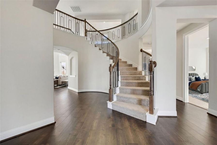 This stunning, brand-new Grand Home is located in the prestigious, GATED Lakes of Somercrest community and is move-in ready. The spacious, floorplan includes 4 generously sized bedrooms and 4 expansive living areas, ideal for both everyday living and entertaining. Highlights of the home include a vaulted family room, a dedicated home office or den, a gameroom, a media room, and a downstairs guest suite or nursery. The home showcases high-end finishes, including a curved oak staircase with wrought iron balusters, a striking front door, wood flooring, and 8-foot doors. The open-concept family room features a gas fireplace and seamless flow into the chef-inspired kitchen. The kitchen is outfitted with custom Shaker cabinets, granite countertops, stainless steel appliances, a 5-burner gas cooktop with a custom wood vent hood, a large center island, and a breakfast bar. The luxurious primary suite offers a two-sided fireplace shared with the spa-like bath, which features a garden tub, a tiled shower, and dual vanities. Upstairs is dedicated to family entertainment, with a gameroom and media room, perfect for kids and guests. Energy-efficient features include a tankless water heater, R38 insulation, and a radiant barrier roof, contributing to lower utility costs. The home also includes a security system and sprinkler system for convenience and peace of mind. This energy-efficient, meticulously crafted home offers a perfect combination of luxury, comfort, and functionality.