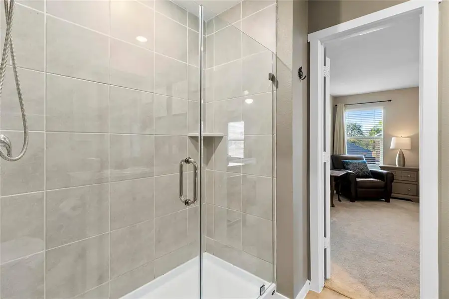 In the primary bathroom, a fully tiled shower with a glass enclosure replaces the standard curtain—bringing a spa-like experience to your daily routine. Additional comfort comes from added ceiling fans in the living room and primary suite, while installed gutters provide practical peace of mind.