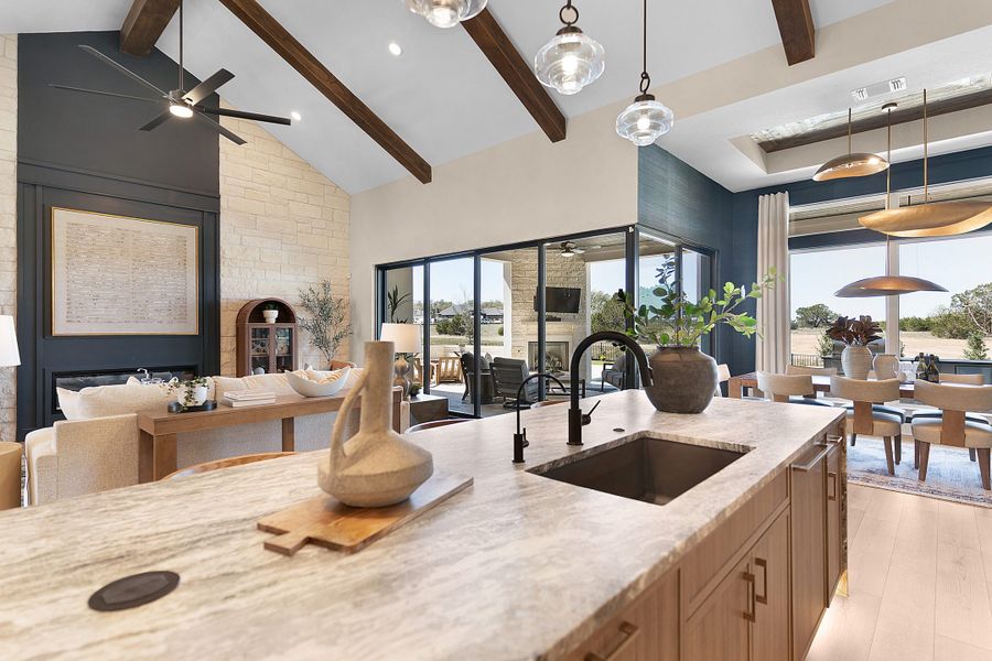The kitchen is a chef’s dream, featuring a large island overlooking the family room and a prep kitchen conveniently tucked inside the pantry for extra storage and organization.