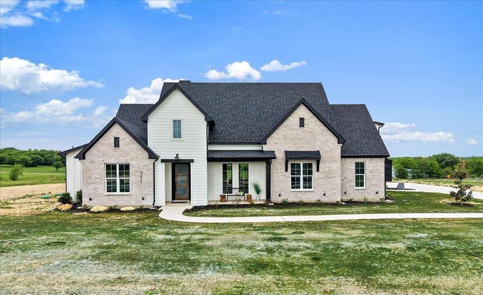 Nestled outside the city limits, this exceptional 2-acre estate offers a rare opportunity to create the lifestyle you’ve always envisioned—free from HOA restrictions and with remarkably low taxes. The animal-friendly zoning allows for a wide range of livestock, from chickens and goats to cows and horses, making it the perfect blend of luxury country living. Built by Homeroots Luxury Homes, this custom home boasts wide-plank wood flooring, soaring ceilings, and designer lighting throughout. The thoughtfully designed layout includes four bedrooms, two which are primary ensuites, three full baths, a half bath, generous living spaces, and an upstairs flex area ideal for a dedicated office, media room, fifth bedroom, or game room. The stunning kitchen is a centerpiece, featuring quartz Bianca Carrara countertops, Pebble shaker cabinetry, a honed herringbone marble mosaic backsplash, Bosch stainless steel appliances, a deep farmhouse sink, statement pendant lighting, and an oversized island perfect for entertaining. The living area is anchored by a striking honed marble fireplace and opens seamlessly to an oversized covered patio overlooking the expansive acreage. The primary suite is a private retreat with a deep Hollywood tub, elegant gold fixtures, and Bianca Carrara quartz finishes. Additional highlights include an extended 3-car garage, a detached shop with electricity, and ample space for future enhancements tailored to your lifestyle. Located just minutes from Tanger Outlets, elevated shopping and dining, and only 35 minutes from DFW Airport, this property delivers the rare combination of serenity, sophistication, and country living with modern convenience.