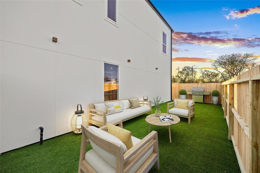 The primary suite is a true retreat with soaring 17-foot ceilings and a spa-inspired en-suite featuring floor-to-ceiling travertine tile, a free-standing soaking tub, dual vanities, a walk-in shower, and a large walk-in closet. The second floor offers a versatile flex space ideal for a game room, home office, or additional living area. Two additional bedrooms, a half bath on the main level, and exceptional outdoor space complete the home, including a fully fenced ~700 sq. ft. high-quality turf yard, private 10-foot patio, and 8-foot side yards on both sides. Community amenities include a dog park for added convenience. Schedule your private tour today.
