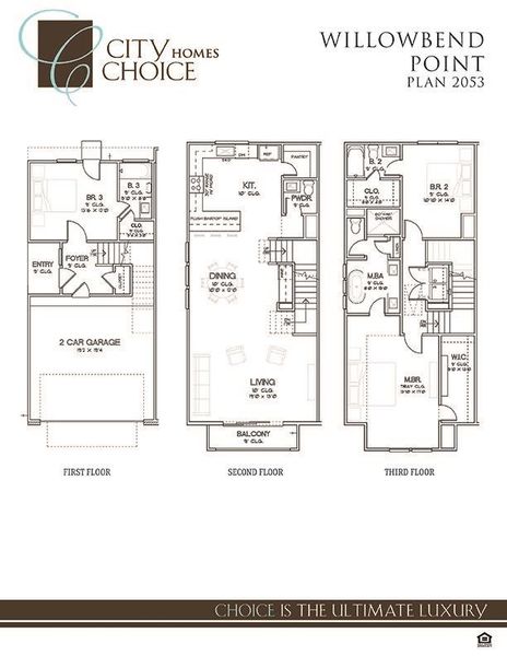 Three-story 2053 sq. ft. home in desirable Willowbend Point offering 3 bedrooms and 3.5 baths. First floor features a private bedroom with full bath and attached two-car garage. Second floor includes open-concept living and dining, kitchen with peninsula island and pantry, powder bath, and private balcony. The third floor offers a primary suite with walk-in closet and ensuite bath, plus an additional bedroom with full bath. Efficient layout with ample storage.