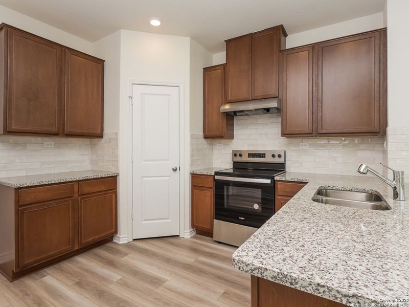 Step into this beautifully designed home featuring 9 - ft. first - floor ceilings th at create an open and inviting atmosphere. The kitchen is a chef's delight, showcasing Arctic Pearl granite countertops, a chic Daltile tile backsplash, and an extended breakfast bar perfect for casual dining or entertaining. The primary bath offers a spa - like retreat with a 42 - in. shower accented by elegant Emser tile surround. Durable and stylish vinyl plank flooring flows seamlessly throughout the home. Modern conveniences include a wireless security system for added peace of mind. Outside, enjoy a cove red patio and an automatic sprinkler system to keep your yard vibrant year - round