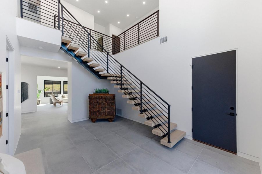 Designed with both style and function in mind, the home showcases high ceilings and an open-concept layout ideal for entertaining. The kitchen is a standout with a quartz waterfall island, built-in Jenn-Air refrigerator, under-cabinet Jenn-Air drawer microwave, double wall ovens, induction cooktop, and pot-filler. Double sliding doors in the living room open seamlessly to the patio, creating effortless indoor-outdoor flow. Enjoy cozy evenings by the interior fireplace or gather around the outdoor firepit under the stars. Upstairs, a rooftop deck provides panoramic views, while the dedicated media room features a wet bar along with a built-in refrigerator and freezer—perfect for movie nights or game days. The primary suite offers a spa-inspired bath complete with anti-fog vanity mirrors, a freestanding soaking tub, and a dual-head shower.