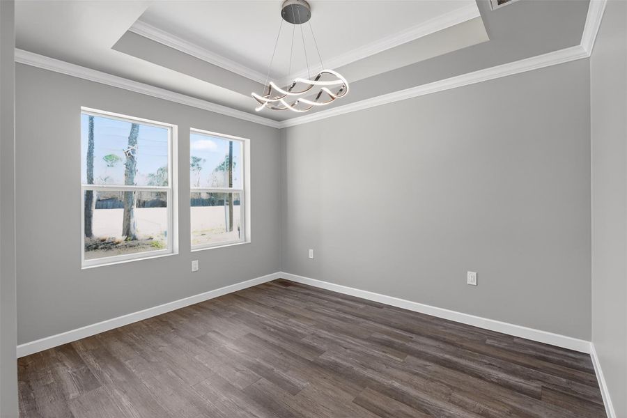 Experience modern farmhouse elegance in this stunning home featuring neutral yet trendy accents and stone details. The open-concept interior boasts high ceilings and designer lighting. A sophisticated dining room with a tray ceiling and contemporary chandelier sets the stage for effortless entertaining.