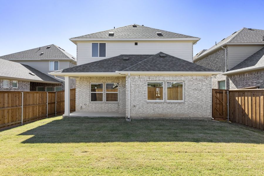 New construction home for sale with 3 bedrooms, 2.5 baths, 2 car garage, and an upstairs gameroom. The deluxe kitchen features quartz countertops, a square tile backsplash, white cabinetry with a stained island, GE stainless steel appliances, and thoughtful upgrades like pot-and-pan drawers below the gas cooktop and a pull-out trash can drawer. Engineered hardwood flooring runs through the main living areas on the first floor, creating a warm, cohesive look in this open-concept home. High ceilings in the living room enhance the ambiance of the home and the open railing on the second floor connects the gameroom views. The master bath includes a shower with hex mosaic tile mudpan and glossy white subway tile on the walls, adding a sleek, modern touch. The extended covered patio is perfect for outdoor gatherings and comes with a gas drop for a future grill.