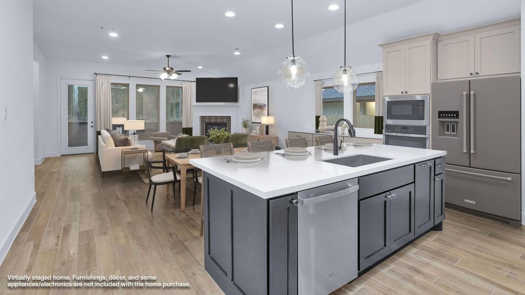 READY FOR MOVE-IN! Entry with 13-foot ceilings framed by game room with French doors. Extended entry flows to the kitchen and dining area. Island kitchen with built-in seating space, 5-burner gas cooktop and a corner walk-in pantry. Family room with a wood mantel fireplace and wall of windows. Secluded primary suite. Primary bath offers dual vanities, garden tub, separate glass enclosed shower and two walk-in closets. Guest suite with a full bathroom and a walk-in closet. Secondary bedrooms and a utility room complete this one-story design. Covered backyard patio. Mud room just off the three-car garage.