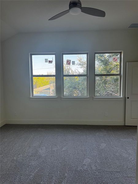 The primary bedroom is a true retreat, offering tranquil, tree-lined views. Throughout the home, you'll find thoughtful design touches like low-E, double-pane windows with screens, squared drywall corners, and a cohesive color palette for walls and ceilings.