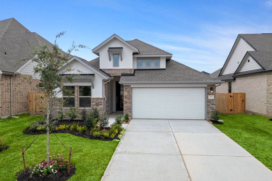Discover the perfect blend of style and functionality in this stunning single-story home, featuring an elegant brick and stucco exterior. Designed for modern living, it offers a spacious office and an open-concept layout that seamlessly connects the main living areas. The gourmet kitchen is a chef’s delight, boasting built-in stainless steel appliances, 42-inch cabinets, quartz countertops, and an oversized island overlooking the great room and casual dining area. Luxury vinyl plank flooring adds both durability and sophistication throughout the home. The primary suite is a true retreat, showcasing bow windows, a relaxing garden tub, and a separate shower. Step outside to a Texas-sized covered patio, perfect for entertaining or unwinding in style. Come see it for yourself—schedule a tour today!