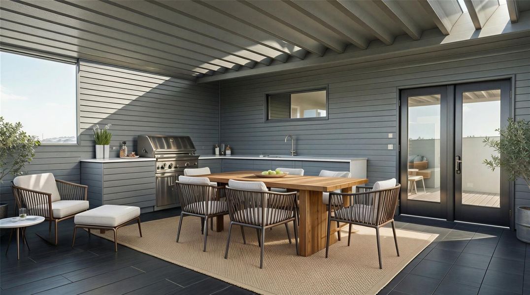 Crafted by Sade Custom Homes, this new construction is located in Camp Logan with direct access to Memorial Park and its trail system. Spanning 4,542 square feet, the residence offers four bedrooms and four-and-a-half baths. Wood flooring and stained wood cabinetry establish a cohesive interior palette throughout. The kitchen is finished with Taj Mahal quartzite countertops, including a waterfall island and slab backsplash, paired with a Thermador appliance package featuring panel-ready refrigeration, dual-fuel range, custom-panel dishwasher, and integrated beverage storage. The primary suite occupies an entire private floor of the home and includes a spacious bedroom and marble-finished bath with freestanding soaking tub, walk-in shower, and oversized closet with custom cabinetry. A fourth-floor game room opens to a private sky deck overlooking Memorial Park. Additional features include an outdoor kitchen and a dark brick exterior with contrasting trim.