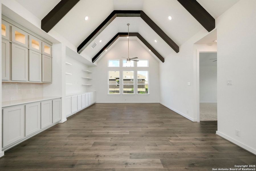 1 story home with 2613 sf. 4 bdrms, 3.5 baths, study, vaulted ceilings in kitchen/dining and family room with beams, enhanced pantry plus oversized walk-in pantry, built in cabinets at hutch and family room, extended primary suite and extended covered patio. Home is backed up to green space.